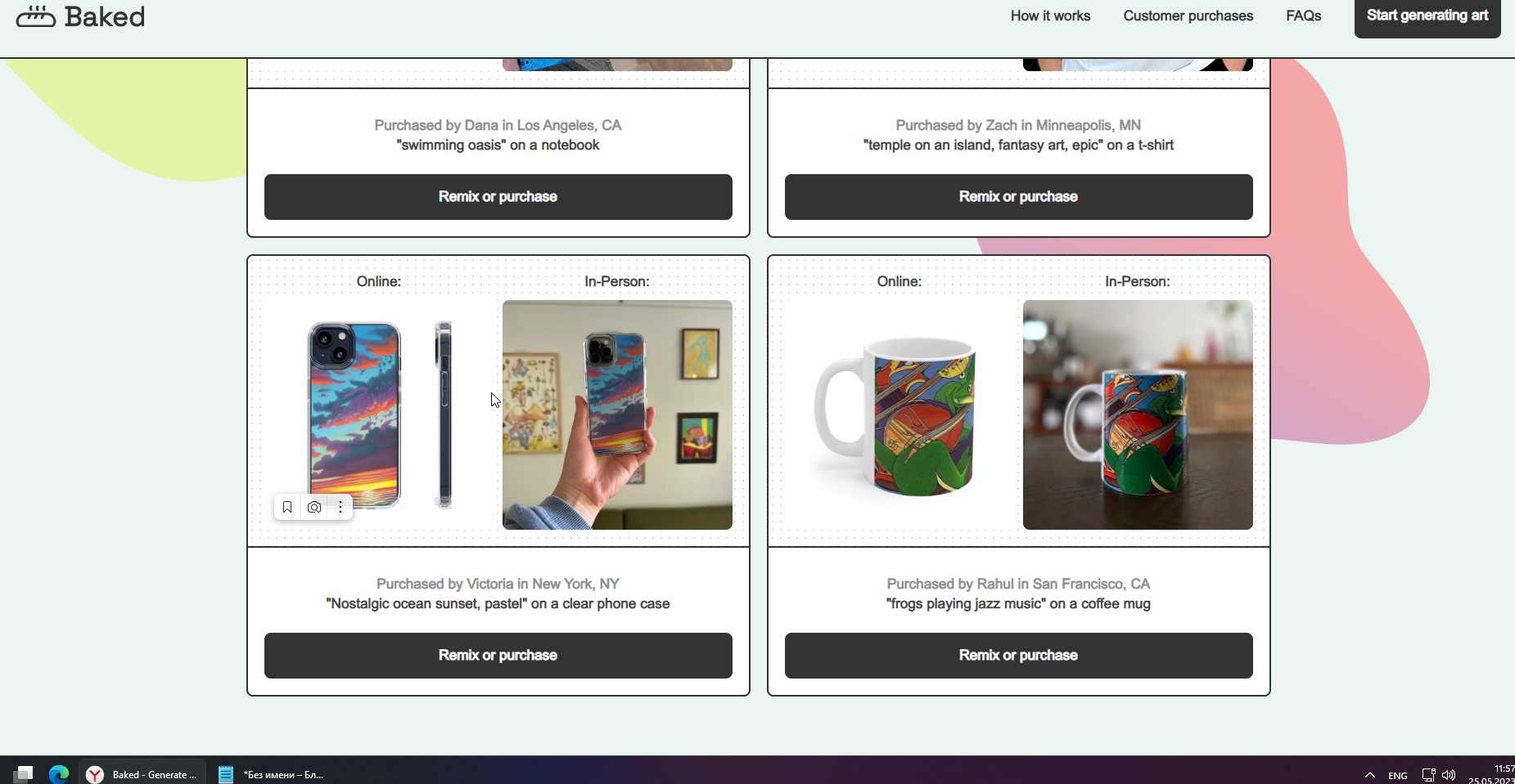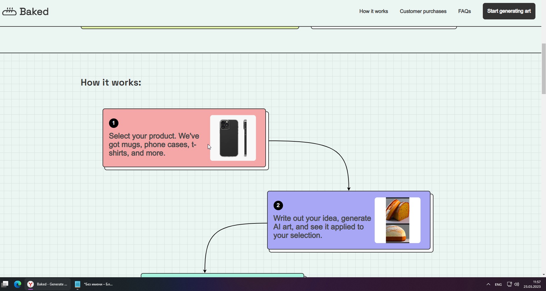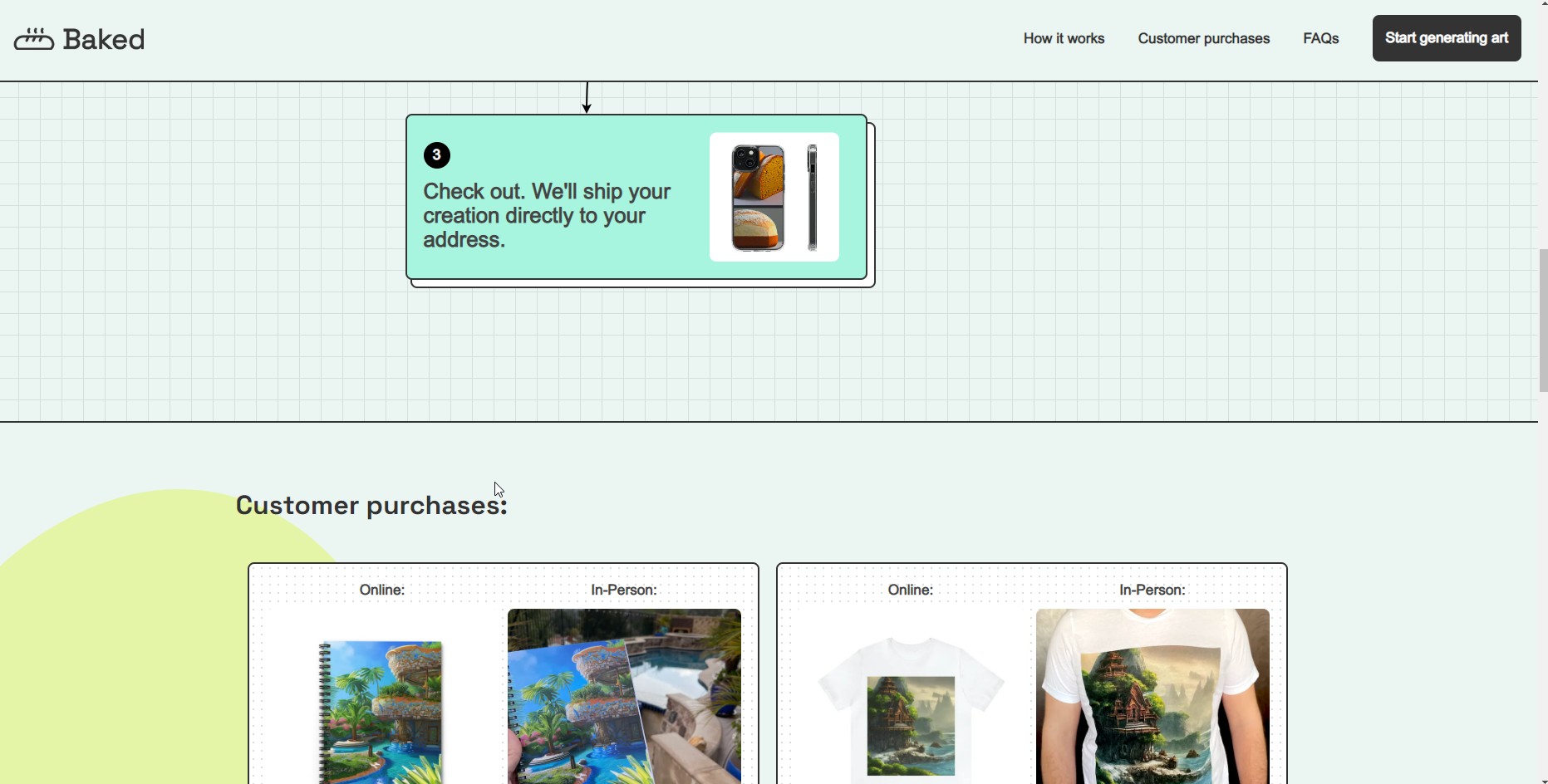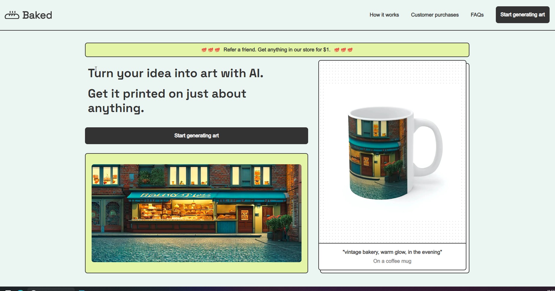 Baked AI Features Baked is an AI-powered service that turns thoughts into unique and creative art for various products. AI-generated art: special software is used to create distinct pictures for each user Print variety: Print artwork on mugs and other items Easy to use process: Select an item, write an idea or upload an image, and check out Image upscaling: improve print quality after purchase Choose any availabl designs or make your own All in all, Baked helps to transform ideas into creative artwork utilizing AI technology and a range of product options.