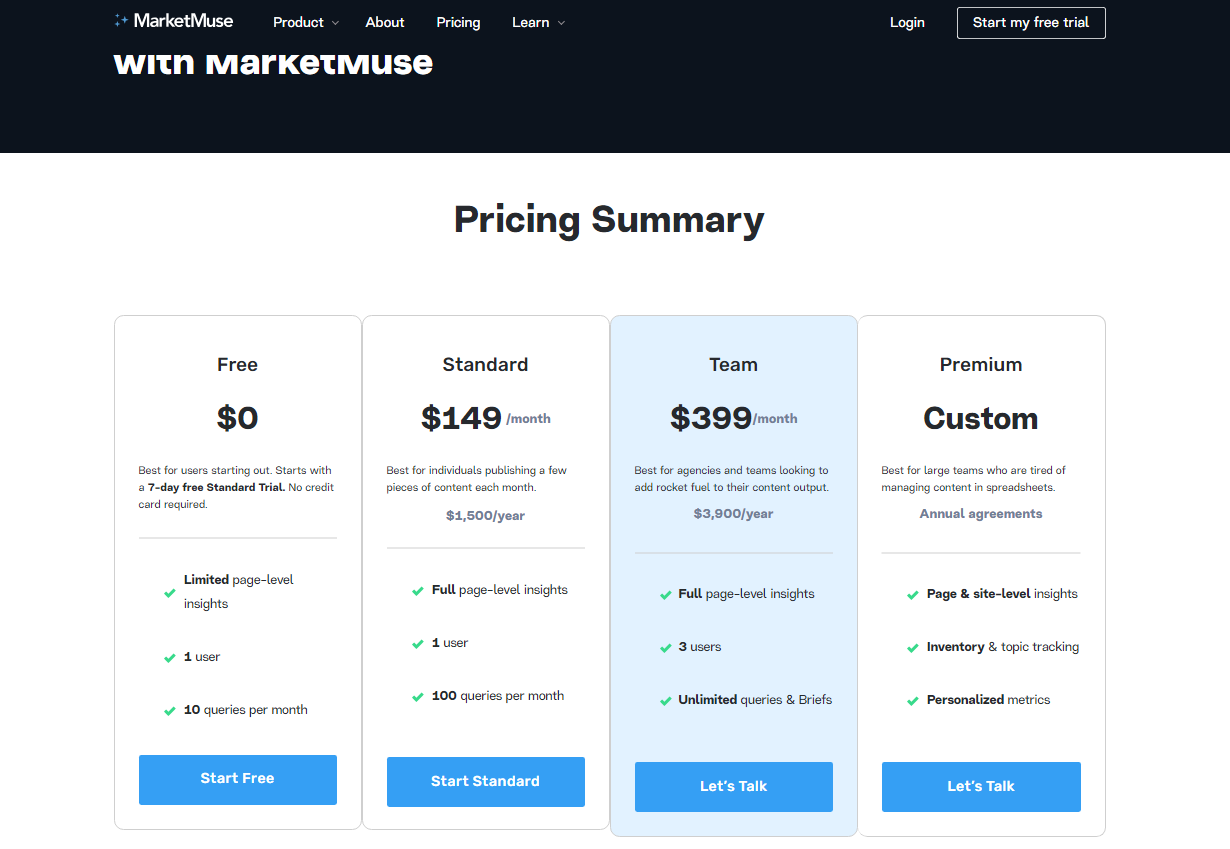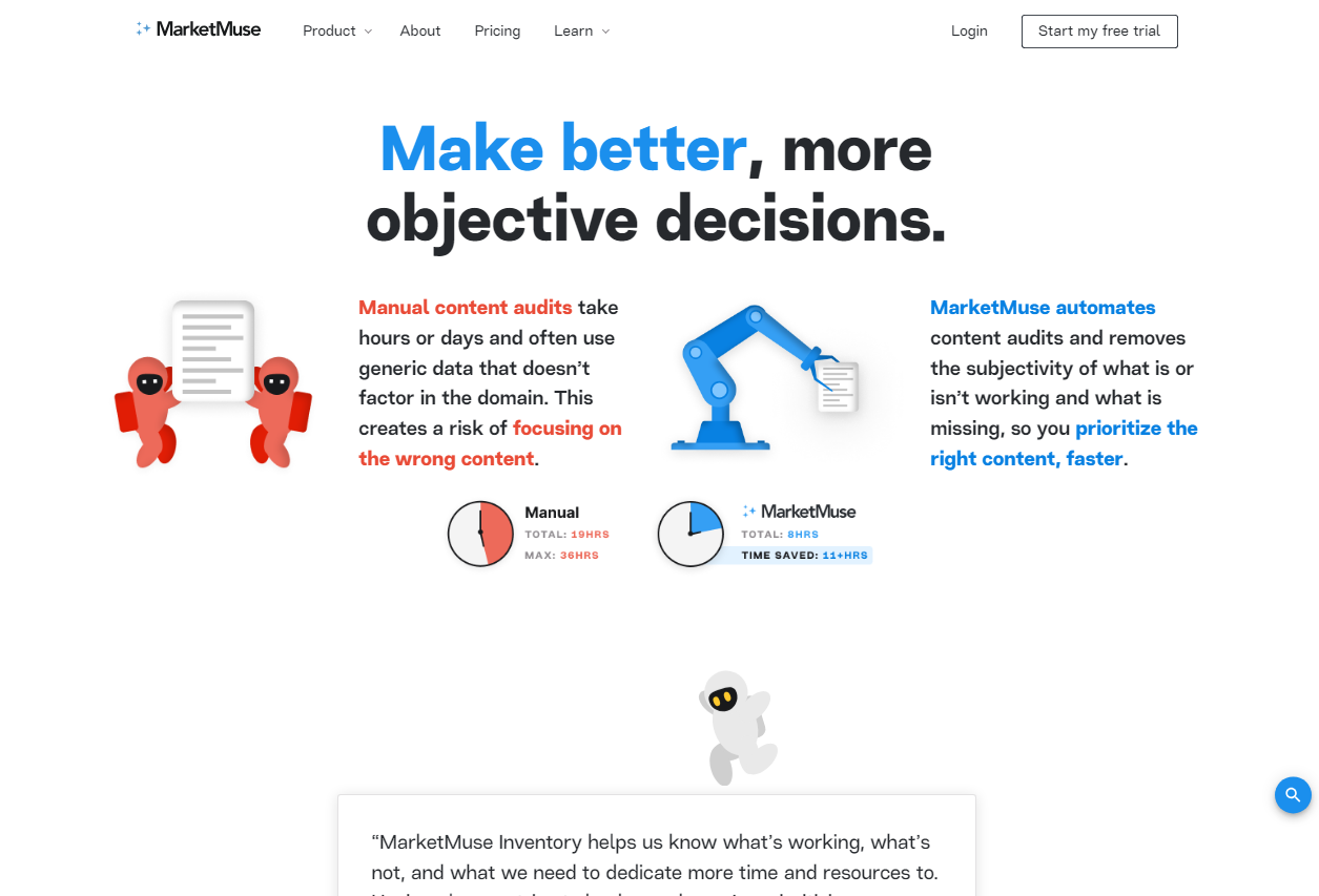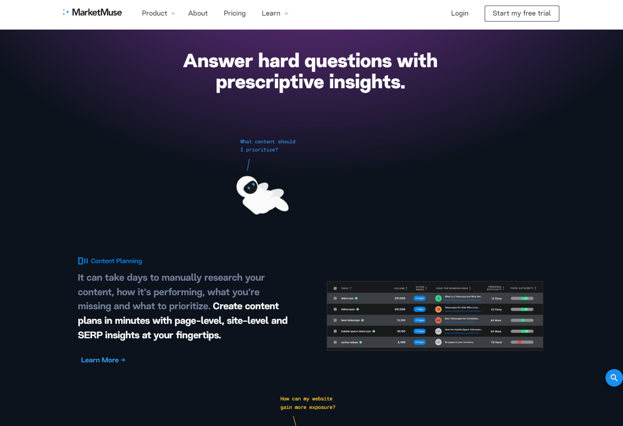 MarketMuse is a transformative AI instrument curating content strategies for businesses looking for a competitive advantage. Importantly, it elucidates loopholes in content architecture, empowering users to craft compelling, SEO-optimized content. MarketMuse's holistic analysis scans thousands of webpages, identifying relevant keywords to help maximize search engine visibility. It's a groundbreaking game-changer, revolutionizing content benchmarking through semantic analytics. AI-powered predictions for content success and user engagement add another feather to MarketMuse’s remarkable suite of features. Additionally, it integrates effortlessly into traditional marketing workflows, enhancing efficiency and productivity. Equipped with intelligent suggestions to boost rankings and drive organic traffic, MarketMuse is a vessel sailing you toward your content's potential pinnacle. Embrace this cutting-edge technology to harness the power of AI in your marketing strategies and outshine in the ever-evolving digital landscape. Unquestionably, MarketMuse is the bridge between your content and its deserved audience.