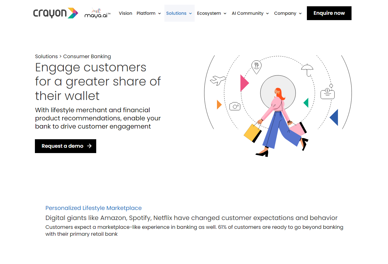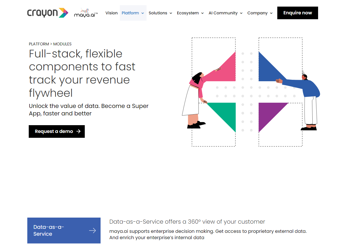 Maya.ai, Crayon Data’s flagship platform, empowers enterprises to unlock the potential of their data, fueling a revenue flywheel. This solution streamlines the path to becoming a Super App, boasting impressive results with significant business returns by improving overall revenues by 5-15%, sales conversions by 10-20%, and boosting customer engagement by a striking 25-35%. Tapping into the rapidly expanding yet often underused resource of data, maya.ai crafts tailored insights for targeted customer engagement. Not only does it enhance enterprise growth, but it also improves customer experiences significantly. With its successful track record, maya.ai is the key to harnessing your data efficiently and propelling your business to new heights. Discover the benefits today.