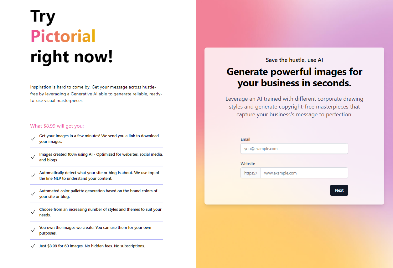Pictorial stands as a novel AI-driven companion, streamlining the graphic creation journey for web applications effortlessly. Harnessing the power of Generative AI, it crafts reliable and ready-to-use visual masterpieces, responding intuitively to user input. A palette of options unfolds, empowering users to cherry-pick designs and seamlessly tweak them to match their vision. Pictorial marks a watershed moment as the first practical application of Generative AI tailored specifically for businesses. In the realm of specialists, it caters to web devs sculpting visually captivating applications, content makers elevating their message with stunning graphics, and businesses optimizing time and effort in the intricate landscape of design tasks. Pictorial, where the intricate meets the intuitive, ensuring the spotlight remains on the essence of the message and content.
