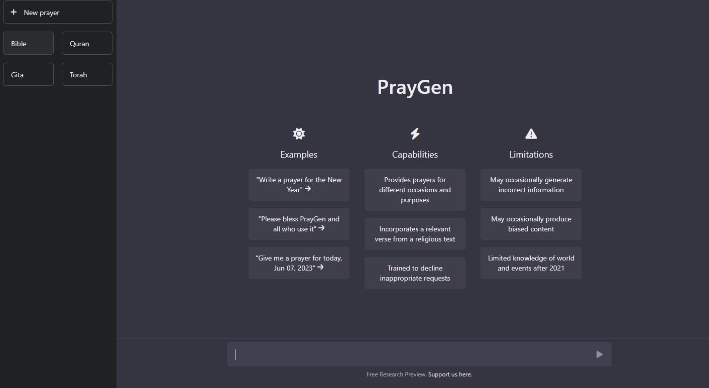 PrayGen is a groundbreaking AI tool revolutionizing the way we engage with prayer. Designed to assist individuals in various occasions and purposes, this powerful application utilizes artificial intelligence to generate heartfelt prayers. With a comprehensive database of religious texts and scriptures, PrayGen provides an extensive collection of prayer templates tailored to specific needs. What sets PrayGen apart is its ability to adapt and decline inappropriate requests. Through sophisticated training algorithms, the tool has been meticulously programmed to ensure that it upholds the sanctity and reverence associated with prayer. By filtering out any content that may be considered disrespectful or offensive, PrayGen maintains the integrity of the spiritual experience. However, it is important to note that PrayGen does have its limitations. As with any AI technology, occasional inaccuracies may occur in the generated content. While the system strives to provide accurate and meaningful prayers, there might be instances where the output may not align perfectly with the user's intentions. Feedback from users is crucial to enhance and refine PrayGen's capabilities continually. Another limitation of PrayGen is its knowledge cutoff at the year 221. Due to the evolving nature of the world and events, the tool's understanding of current affairs beyond that date is limited. Therefore, it may not incorporate the most up-to-date information or context from the world. Users should exercise discretion and supplement the generated prayers with their own knowledge and insights. PrayGen has the potential to be an invaluable resource for individuals seeking guidance, solace, or spiritual connection. Whether for personal use, religious services, or community gatherings, this AI-powered prayer generator offers a convenient and accessible means of accessing prayers for various occasions. As users explore and interact with PrayGen, they contribute to its learning and improvement, ensuring its continual growth and relevance. In a world driven by technological advancements, PrayGen serves as a testament to the positive impact of AI in enhancing human experiences. With its vast collection of religious verses, adaptability, and commitment to maintaining respect and reverence, this tool empowers individuals to engage with prayer in a meaningful and personalized manner.