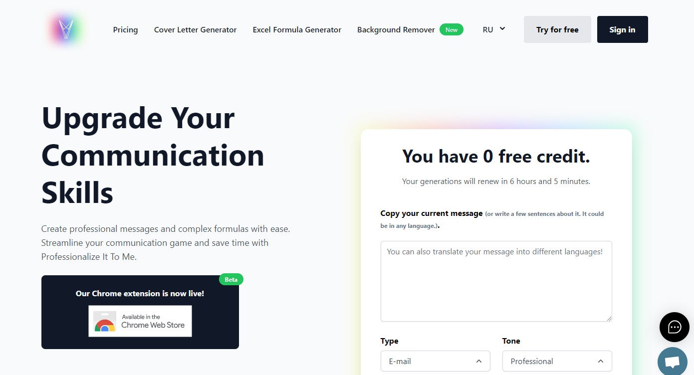 Introducing Professionalize It To Me, a cutting-edge tool designed to streamline the creation of formal emails. With its user-friendly interface and advanced AI technologies, this tool empowers users to effortlessly generate professionalized messages in a matter of seconds. Whether you need to compose a concise business email or a formal communication in any of the six supported languages, Professionalize It To Me has got you covered. By offering five free credits per day, this tool ensures that users can benefit from its powerful features without any financial burden. With an impressive track record of generating 6471 messages, Professionalize It To Me has already established itself as a reliable and efficient solution for enhancing your email communications. Using Professionalize It To Me is a breeze. Simply copy your current message or provide a few sentences as input. Then, select the message type that suits your purpose, choose the desired tone for your email, and specify the language in which you wish to compose it. Once you've provided these details, the tool will work its magic and generate a professionalized email that meets your requirements. Whether you're a busy professional looking to save time or a non-native speaker seeking assistance in crafting formal emails, Professionalize It To Me is the perfect companion. Experience the convenience and efficiency of this remarkable tool as it revolutionizes the way you compose emails. Try it today and elevate your email communication to new heights with Professionalize It To Me.