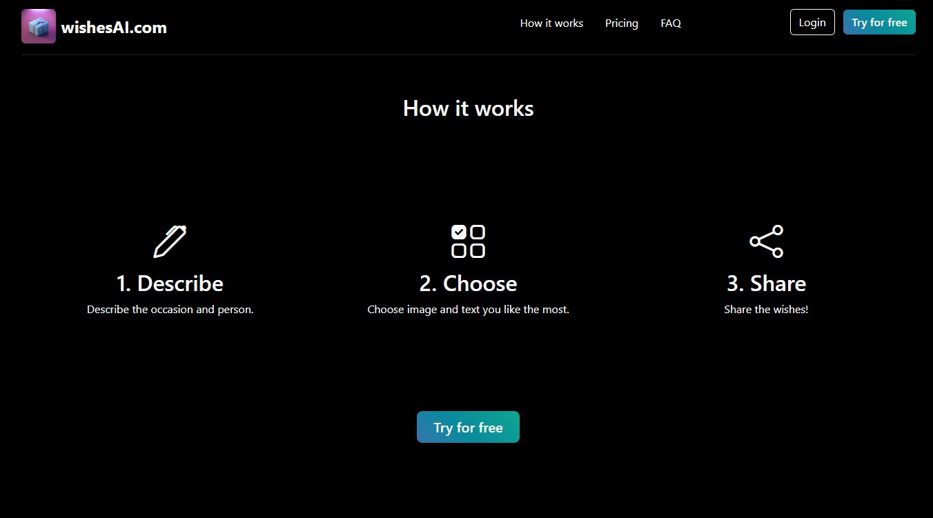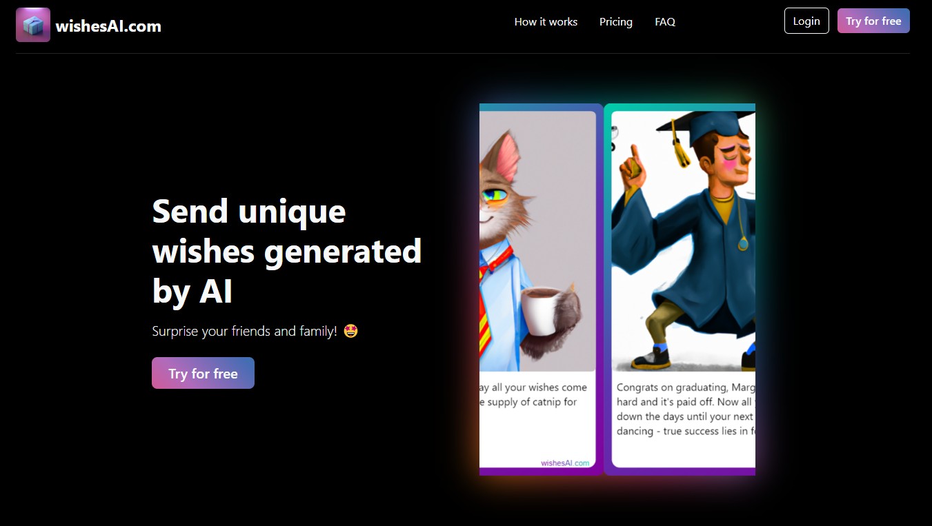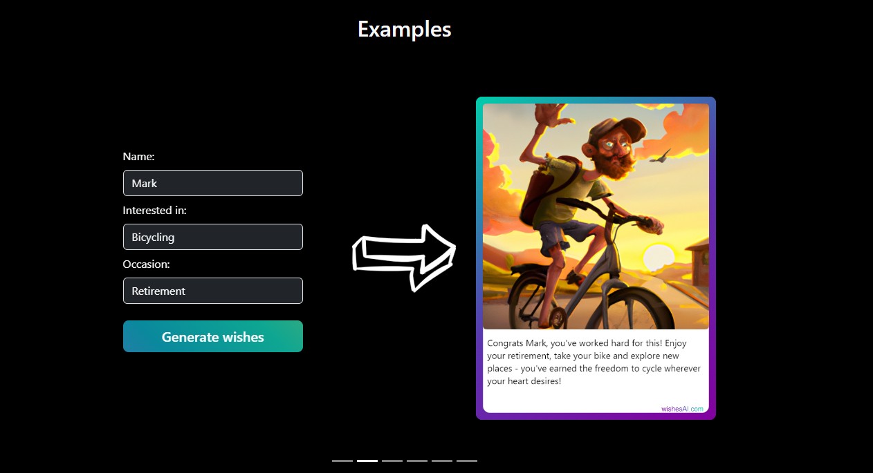 Introducing wishesAI.com, an innovative tool harnessing the power of AI technologies to bring you a delightful way to express your heartfelt wishes for friends and family. With wishesAI.com generating unique, personalised wishes has never been easier. This user-friendly platform offers a seamless experience. In the beginning you simply enter the name of the person you want to celebrate and the special occasion. Whether it's a birthday, anniversary, graduation, or any other memorable moment, wishesAI.com has got you covered. To add a personal touch, wishesAI.com allows you to select an image that perfectly captures the essence of your wish. Browse through a diverse range of visuals, from enchanting landscapes to adorable illustrations, ensuring the recipient receives a visually captivating surprise. But the magic doesn't stop there. Thanks to the incredible capabilities of AI, wishesAI.com generates text that complements your chosen image and the occasion. The AI algorithm crafts unique, heartfelt messages that convey your emotions in a meaningful way. Whether you're aiming for a touch of humor, a heartfelt sentiment, or an inspiring message, wishesAI.com delivers a tailor-made wish that truly reflects your intentions. With wishesAI.com, you can say goodbye to generic greetings and predictable messages. Each wish is thoughtfully crafted to honor the individual you're celebrating, making every moment unforgettable. The fusion of advanced AI technologies and your personal inputs results in a one-of-a-kind wish that is sure to bring joy and warmth to the recipient's heart.