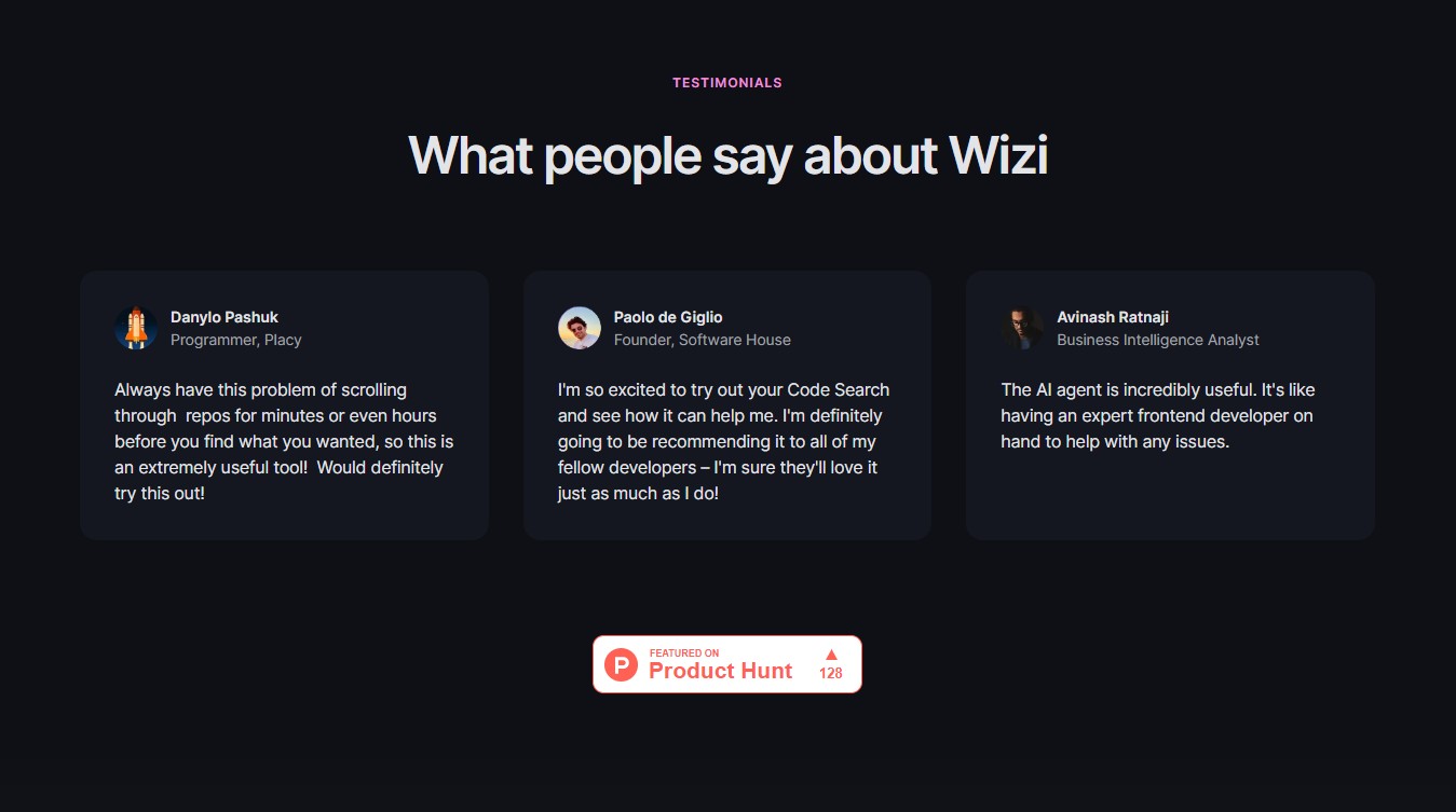 Wizi is an exciting new tool for frontend teams that promises to make their lives easier by streamlining the process of searching for React code using natural language. This innovative code search feature allows users to find exactly what they're looking for in seconds, saving valuable time and increasing productivity. But Wizi isn't just a code search tool. It also comes equipped with an AI agent that can help with a variety of common frontend tasks. Whether you're creating new features, refactoring existing code, migrating files, or updating HTML/CSS, Wizi has you covered. One of the key advantages of Wizi is its user-friendly interface. The tool is designed to be intuitive and easy to use, even for those with little or no coding experience. This makes it an ideal solution for frontend teams who need to work quickly and efficiently. Another advantage of Wizi is its flexibility. The tool can be customized to suit the specific needs of your team, making it a versatile and adaptable solution that can grow and evolve with your business. If you're interested in trying out Wizi for yourself, the good news is that it's launching soon. You can reserve a spot to get early access and be one of the first to experience the benefits of this exciting new tool. Overall, Wizi is a game-changing tool that has the potential to revolutionize the way frontend teams work. With its powerful code search feature and AI agent, it's a must-have tool for any team looking to stay ahead of the curve in the competitive world of web development.