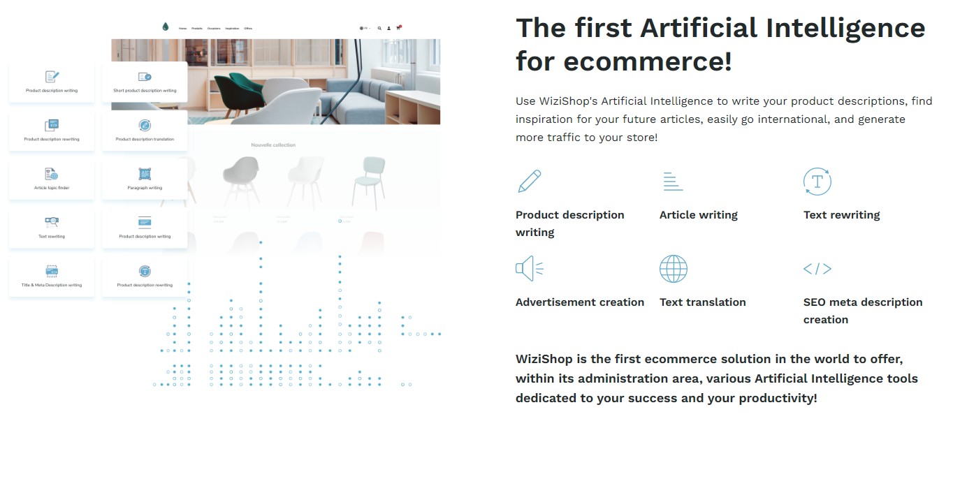 WiziShop is a powerful tool that can revolutionise the way you manage your e-commerce business. With its advanced AI capabilities, WiziShop makes it easy for you to write compelling product descriptions that will grab the attention of your customers and help you stand out in a crowded online marketplace. But that's not all - WiziShop's AI technology can also help you find inspiration for future articles, making it easy to stay on top of industry trends and keep your customers engaged with fresh and informative content. And if you're looking to take your business global, WiziShop makes it easy to translate your content into multiple languages, allowing you to reach a wider audience and generate more traffic to your store. Overall, WiziShop is an incredibly powerful tool for e-commerce businesses looking to leverage the power of AI technology to improve their online presence. Whether you're just starting out or you're a seasoned pro, WiziShop has the features and functionality you need to take your business to the next level and achieve greater success in the competitive world of e-commerce. So why wait? Give WiziShop a try today and see the difference it can make for your business!